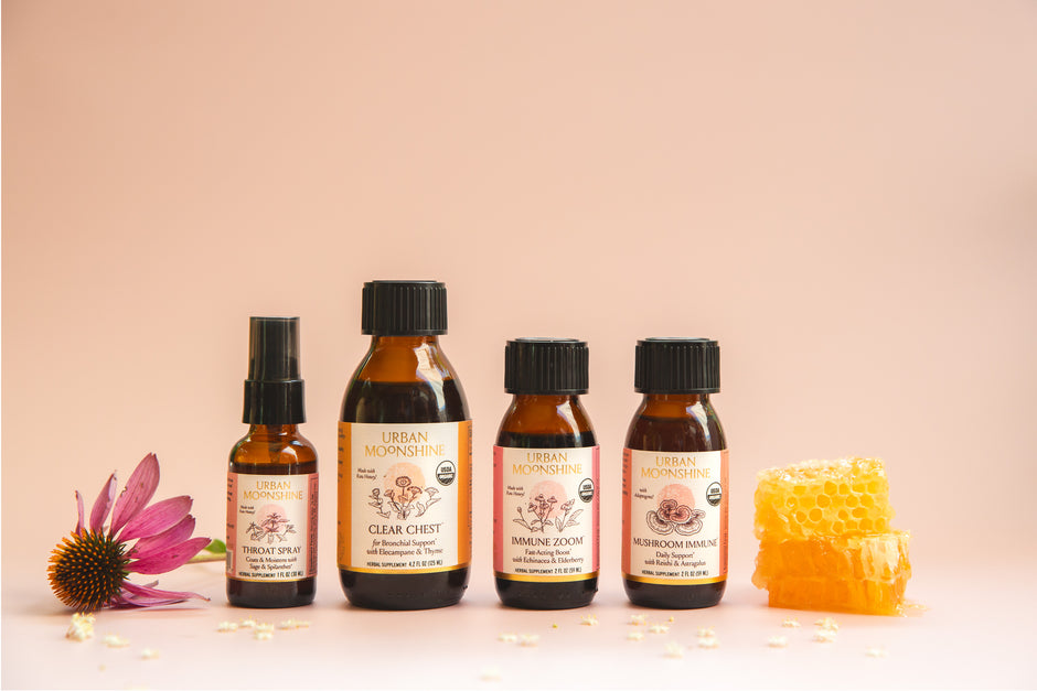 Bundle to stock your seasonal apothecary & stay well.* Includes Clear Chest, Immune Zoom, Throat Spray, & Mushroom Immune!