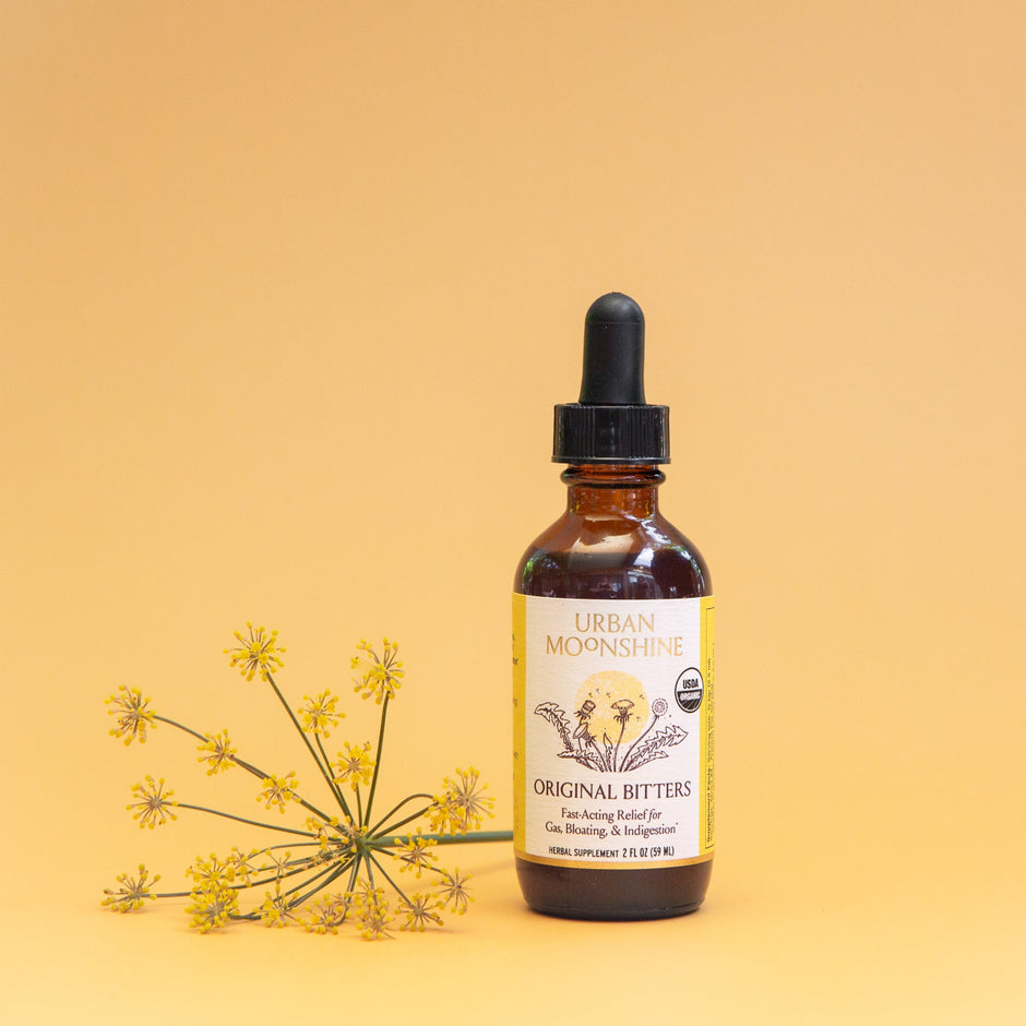 Urban Moonshine Calm Tummy Bitters are a soothing blend of chamomile and ginger paired with classic bitter herbs like dandelion and burdock. They contain a higher ginger content and are our only formula with chamomile, specifically designed to target occasional nausea and morning sickness.*