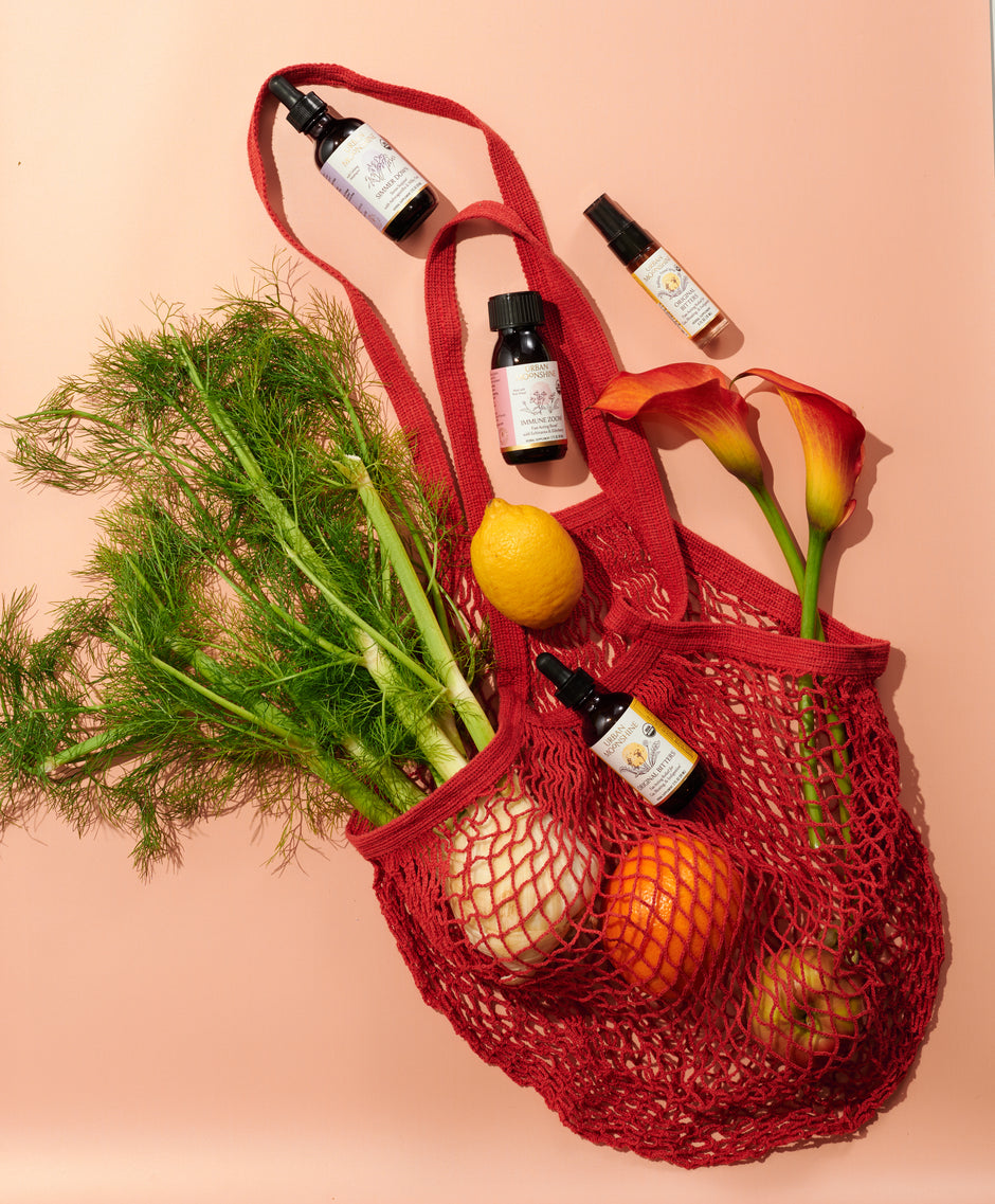Beautiful large organic cotton tote with custom herbal lifestyle illustrations