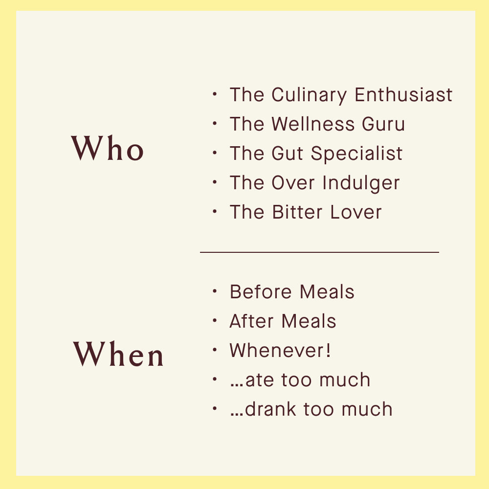 “We use bitters whenever we are feeling a little digestive discomfort and they always save the day! So convenient - I keep one in our medicine cabinet, in my purse, and at my desk at work. Excellent product and happy subscriber!”